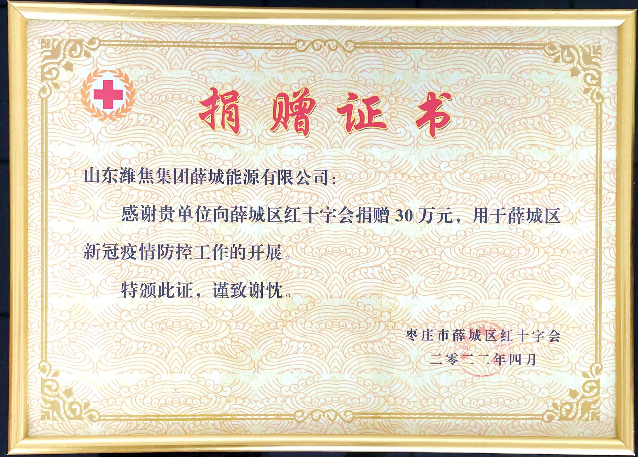 4月11日,薛城能源公司收到棗莊市薛城區紅十字會頒發的捐贈證書及區委統籌疫情防控和經濟運行工作領導小組發來的感謝信,感謝企業為地區疫情防控慷慨捐贈30萬元!